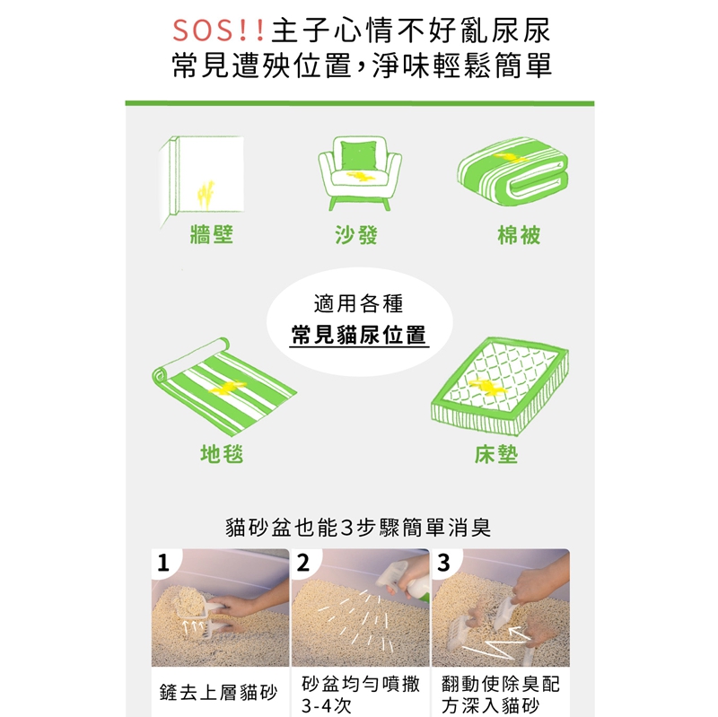 ● 先噴再清:直接噴在異味源(尿液、糞便、使用過尿布墊)再清潔。